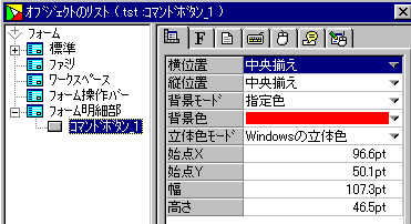 リストの中からコマンドボタンを選んで、背景色を「青」にして挿入ボタンを押します。 イベントファイルに下記の行が挿入されますので、「ハンドル=」の部分を消して下記のようにします。 オブジェクト操作 ハンドル= @コマンドボタン_1.背景色 = "青" ↓ オブジェクト操作 @コマンドボタン_1.背景色 = "青" イベントファイルを保存して閉じます。 フォームの再定義の画面で「表示」→「編集へ」を選んでマウスを移動したらコマンドボタンの色が変わる ことを試してみましょう。 |