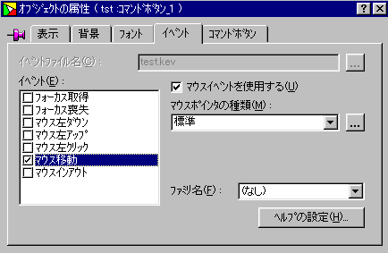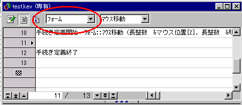 | 4.フォームのオブジェクトの属性設定 フォームの再定義の画面に戻して、コマンドボタンのハンドルを消した状態で、フォームから離れたところで 右クリックをして、オブジェクトの属性を選びます。イベントタブのイベントで、マウス移動にチェックを入れて、 そのマウス移動の部分をダブルクリックします。 イベントの編集画面になりますので、メニューバーの「入力」→「オブジェクトのリスト」を選びます。 このとき、下の画面の○部分が「フォーム」になっていなかったら▼ボタンを押してフォームを選んでおきます。 |