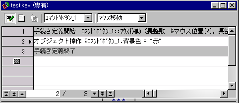 | イベントという概念は桐ver.8で始めて出てきたものであり、従来の桐ユーザーには最初は全くとっつき にくいものであるかもしれません。そこで簡単な例題をやってみることにより、イベントのしくみを理解して もらえれば、と思います。後はその応用でいろんなことにチャレンジしてみてください。 例題として、マウスポインタをコマンドボタンの上に移動したら、ボタンの色が「青」から「赤」に変化する というものを作ってみたいと思います。 結論的には、フォームのコマンドボタンとフォームのオブジェクトの属性のイベントタブでマウス移動にチェックを 入れて、フォームのオブジェクトの属性でイベントタブのイベントファイル名で指定したファイルに下記のように 記述すれば目的を達成することができます。 −−−−−−−−−−−−−−−−−−−−−−−−−−−−−−−−−−−−−−−−−−−−− 名札 メイン * 手続き定義開始 コマンドボタン_1::マウス移動(長整数 &マウス位置[2],長整数 &明細番号,長整数 &フラグ) オブジェクト操作 @コマンドボタン_1.背景色 = "赤" 手続き定義終了 手続き定義開始 フォーム::マウス移動(長整数 &マウス位置[2],長整数 &明細番号,長整数 &フラグ) オブジェクト操作 @コマンドボタン_1.背景色 = "青" 手続き定義終了 −−−−−−−−−−−−−−−−−−−−−−−−−−−−−−−−−−−−−−−−−−−−− マウスが移動されたとき、コマンドボタン_1に来たときにはオブジェクト操作で背景色を赤にして、ボタンを離れて フォームに来たときには、背景色を青に戻しています。 ●イベントファイルを簡単に記述する方法 しかし、上記の記述をいちいち書くのは大変めんどうです。 ところが桐ver.8にはほとんどマウス操作だけで、上記の記述をする機能がついています。 それをこれから説明します。 なお、フォームとコマンドボタンの作成について理解している方は3.から読んでください。 1.フォームの新規作成 まず、「ファイル」→「新規作成」→「フォーム」を選んでOKボタンを押します。 ファイル名入力で任意のファイル名をつけます。 白紙->フォーム定義へを選んで完了ボタンを押します。 これで白紙のフォームができました。 2.コマンドボタンの貼り付け フォームツールパレットがない場合は「表示」→「ツールバー」でフォームツールパレットを表示しておきます。 フォームツールパレットのコマンドボタンを押して、フォーム上にコマンドボタンを貼り付けます。 3.コマンドボタンのオブジェクトの属性設定 コマンドボタンのオブジェクトをクリックしてハンドル(四隅の点)を付けた状態で右クリックし、オブジェクトの 属性を選びます。(オブジェクト名は「コマンドボタン_1」となっています。実際の運用では適当な名前に つけかえましょう。) 背景タブの背景色モードを指定色にして「赤」を設定します。 イベントタブのイベントで、マウス移動にチェックを入れて、そのマウス移動が反転している部分をダブルクリック します。 |